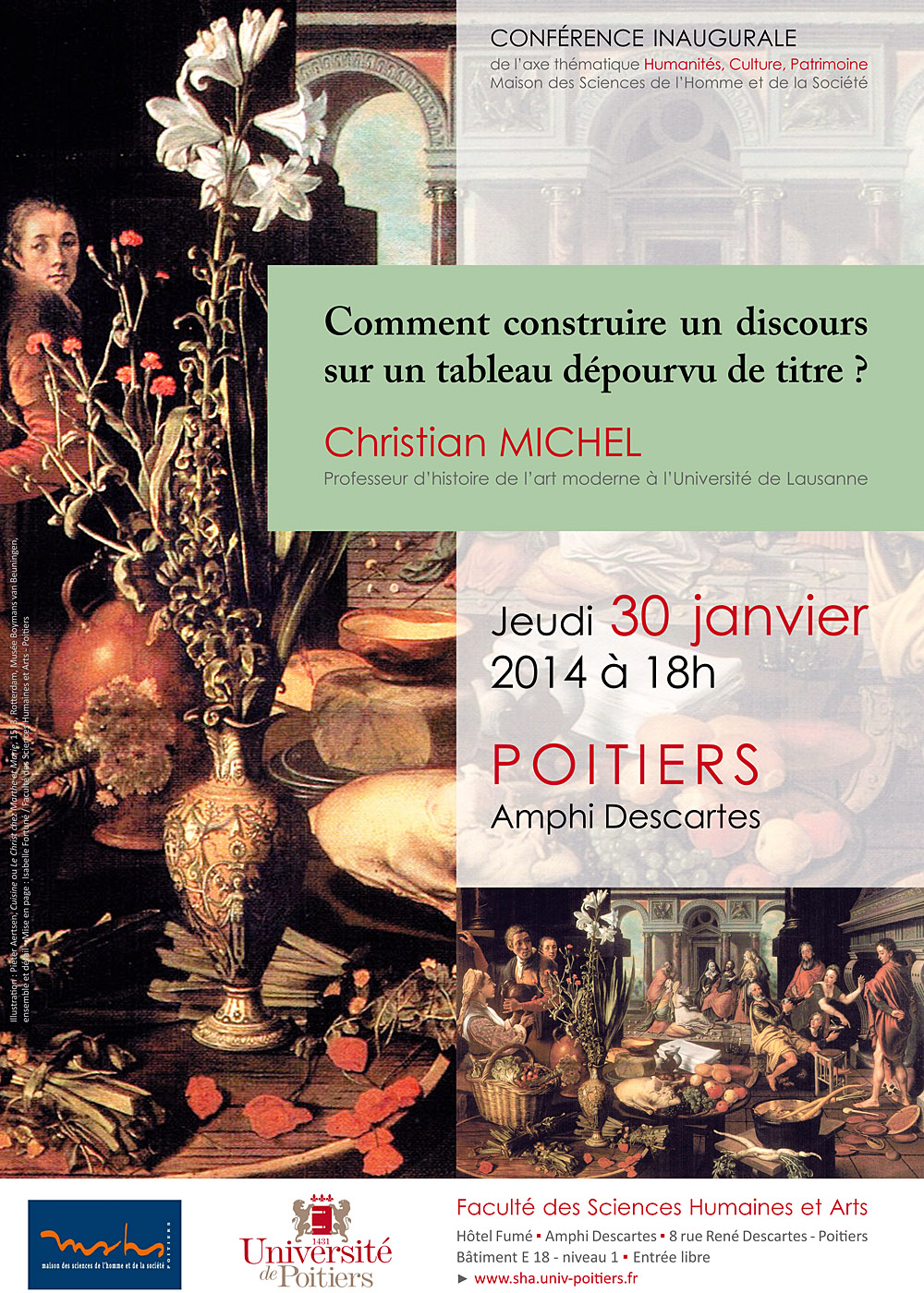 La conférence de Christian Michel portera donc sur cet élément de verbalisation qu’on ne remarque pas, tant il semble évident. Il interrogera les relations complexes qu’entretiennent une image conçue par un artiste et les mots qui servent à la désigner et que la plupart du temps celui-ci ne connaissait pas. Il cherchera aussi à montrer de quelle façon l’emploi de ces mots, résultats parfois d’une analyse implicite, sert de fondement aux analyses ultérieures.