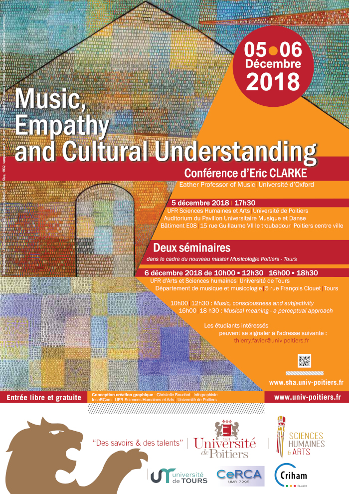 Conférence par Eric Clarke, Eather Professor of Music, Université d’Oxford, organisée par Thierry Favier, dans le cadre du master Musicologie (Poitiers-Tours).