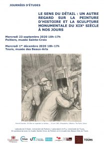 Ces deux journées d’études ont pour objectif d’étudier la question du détail principalement dans l’œuvre de grand format, la peinture d’histoire et la sculpture monumentale. Au fil du XIXe siècle, la représentation de l’histoire et l’hommage sculpté au grand homme ou aux idéaux politiques s’enrichit d’un répertoire de détails et de précisions matérielles (textures, matériaux différents). La peinture d’histoire s’éloigne de plus en plus de ses exigences traditionnelles d’unité de temps et de lieu et de limitation des éléments nécessaires à la narration pour aller vers une peinture plus riche – ou parasitée ? – de détails, d’objets, de costumes destinés à raconter une histoire autant qu’à recréer une atmosphère historique. La sculpture monumentale quant à elle, dans l’hommage au grand homme comme dans le monument commémoratif, intègre de plus en plus l’attribut réaliste comme information biographique et le détail allégorique comme élément discursif. De même, intervient encore ici la notion de rapports d’échelle : comment le grand format, qui impose le regard à distance pour être compris, intègre-t-il le détail, qui impose le regard proche voire intime ? Comment le regard sur la partie peut-il enrichir ou au contraire nuire à la perception visuelle et sonore, à l’expérience physique et émotionnelle de l’art ? Que révèle le détail sur la manière dont l’artiste a pensé sa composition ? Enfin, en termes d’aménagement muséographique, comment le musée intègre-t-il ce paramètre dans l’exposition des œuvres ?